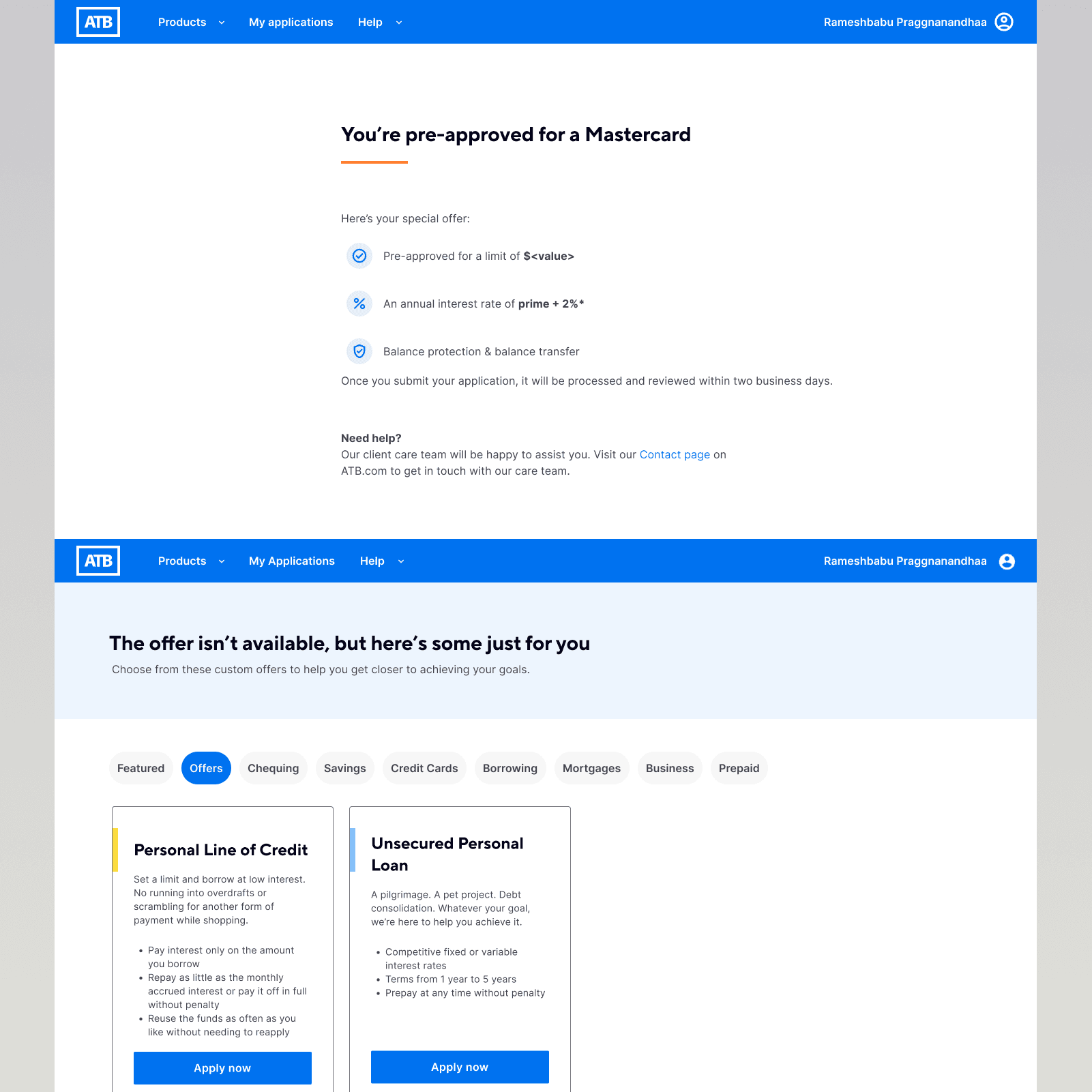 The PAMC project was my first experience with ATB's Digital Onboarding portfolio, and was a fun challenge trying to balance the various risk and technical constraints without harming the overall user experience. The auto-approval process required intermittent checks against a user's credit score to gauge the offers that would be presented to the user, which meant we needed to design a user flow that would be helpful and usable regardless of how the system rated a user's credit score.